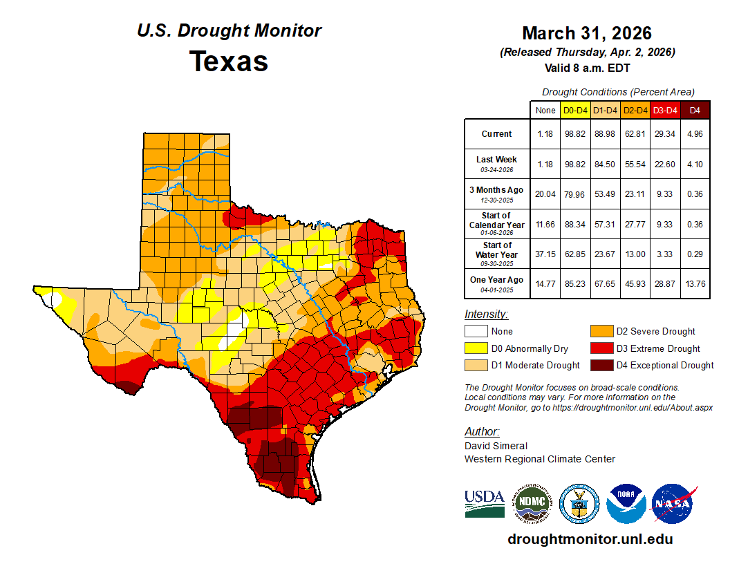 DROUGHT INDEX: In the latest Texas Drought Monitor released on Thursday, January 2, 2026, shows worsening drought conditions across Central, Southeast, and South Texas. “Severe” to “Extreme” Drought conditions spread across the Brazos Valley. This latest drought monitor, including it’s samples, were collected on Tuesday. Therefore, the latest round of rainfall will not be measured until next week’s monitor.